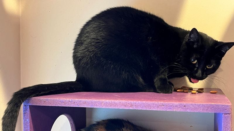 Coco, an all black domestic short hair, came to the rescue as a 3-month-old kitten in June 2018. She came from a feral colony and her fear of people was already well established. Attempts at socialization were not very successful and she became another unadoptable kitten. Living her life at the sanctuary seems to suit her well and after 5 years she is getting comfortable enough to engage in feather toy play. She will probably always be a sanctuary resident.