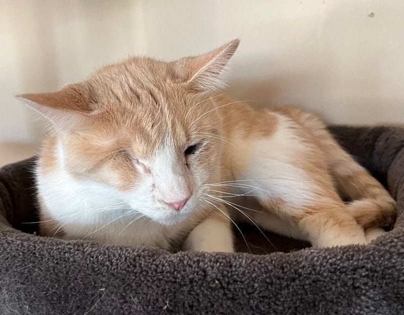 Dino is a dilute orange and white tabby cat that came to the Sanctuary as a kitten. He never came around to trust people we were hopeful that his fearfulness would be temporary but he never quite warmed up to human contact. Heβs generally okay being in the vicinity of humans but will run away if approached. Hugo had a severe eye infection that resulted in the removal of hi right eye. Fortunately, we were able to save his other eye. He is currently in a relationship with Speckles, one of our rescue torties.