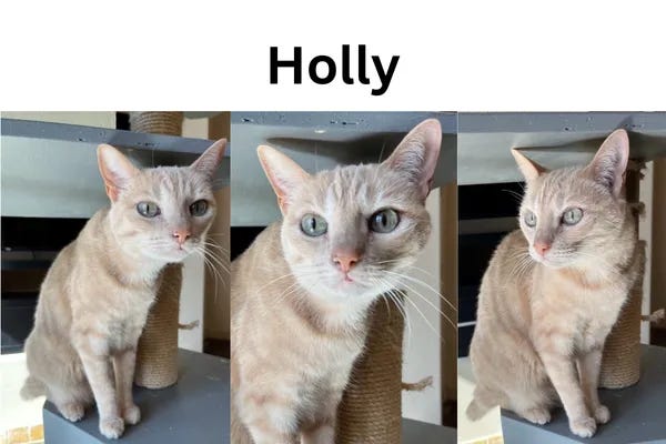 Holly was born in 2009 during the height of kitten season. She was found in the attic of a barn along with her three siblings and brought to the rescue. All the kittens were suffering from heat exhaustion and were not in very good condition. Holly suffered the worst and had several seizures and eventually came down with a condition known as hyperesthesia, a malfunctioning of the sense of touch. With Holly, this resulted in her experiencing hypersensitivity in her tail which she bit to the point where her tail had to be amputated. With surgery and medication, she is able to lead a normal and happy life at the sanctuary.