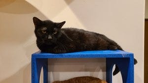 Lulu and her brother, Martin, were adopted as kittens but returned in 2020 because their owner could no longer care for them. We aren’t sure about what happened to Lulu during her time in her first home, but she will often hiss or run away now when approached by humans. She gets along with the other Sanctuary residents, so we are happy to provide her with a safe environment for her to live out her years.