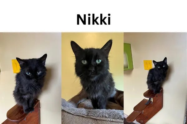 Nikki is a 19-year-old black domestic long hair cat that came to the sanctuary after her person passed away. She is a very affectionate girl that loves attention and enjoys ear scratches and belly rubs. She is too old to be adopted so she will be a permanent sanctuary resident and we are happy to give her a peaceful and safe place to spend her years!