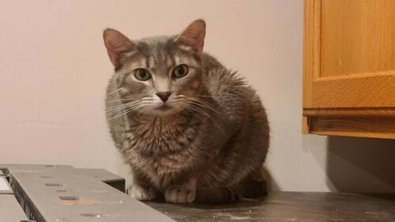 Yaz and her sister were adopted together when they were kittens; however, after a few years in their new home Yaz began bullying her sister and her other kitty roommate. Yaz was returned in June of 2020 and has since set up shop on top of the refrigerator and cabinets of the Sanctuary. She spends the majority of her time there, above the fray, but will occasionally allow human contact for wet food or cookies.
